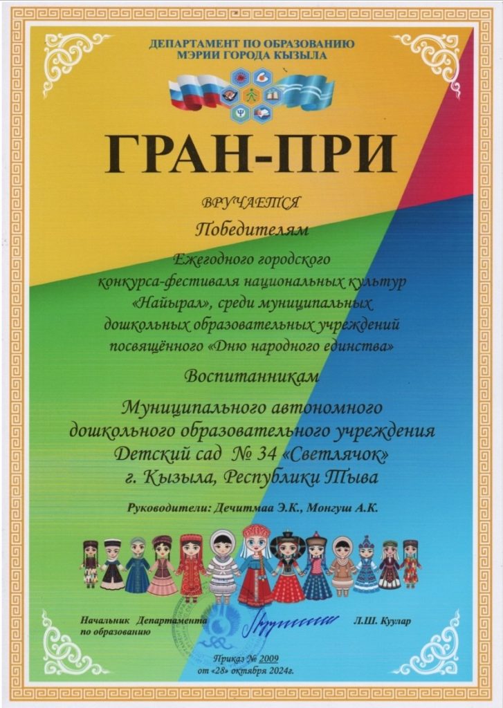 Наши воспитанники стали обладателями Диплома Гран-При в городском конкурсе-фестивале «Найырал-2024» среди детских садов г.Кызыла.