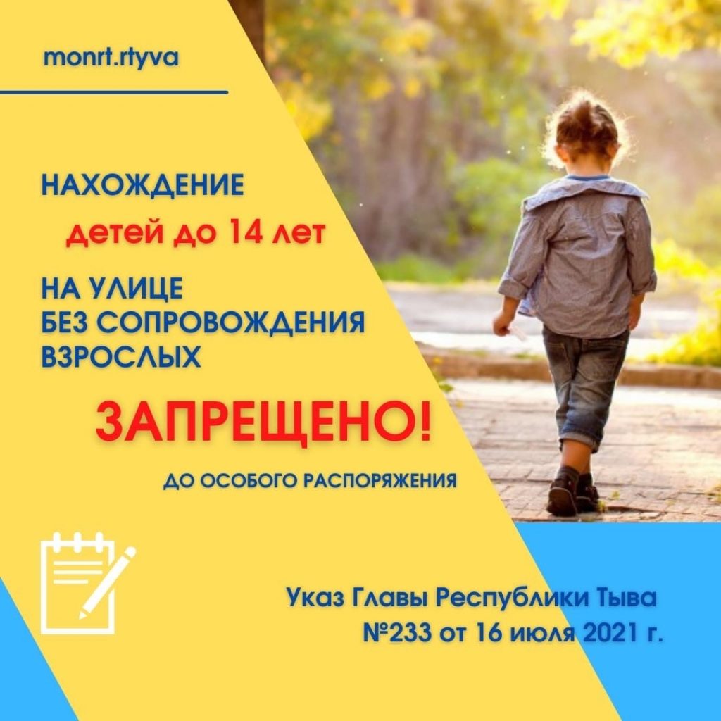 Нахождение детей до 14 лет на улице БЕЗ СОПРОВОЖДЕНИЯ взрослых ЗАПРЕЩЕНО до особого распоряжения! 📍 Основание — Указ Главы Республики Тыва №233 от 16 июля 2021 г.