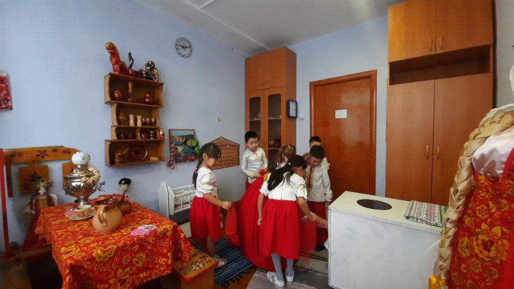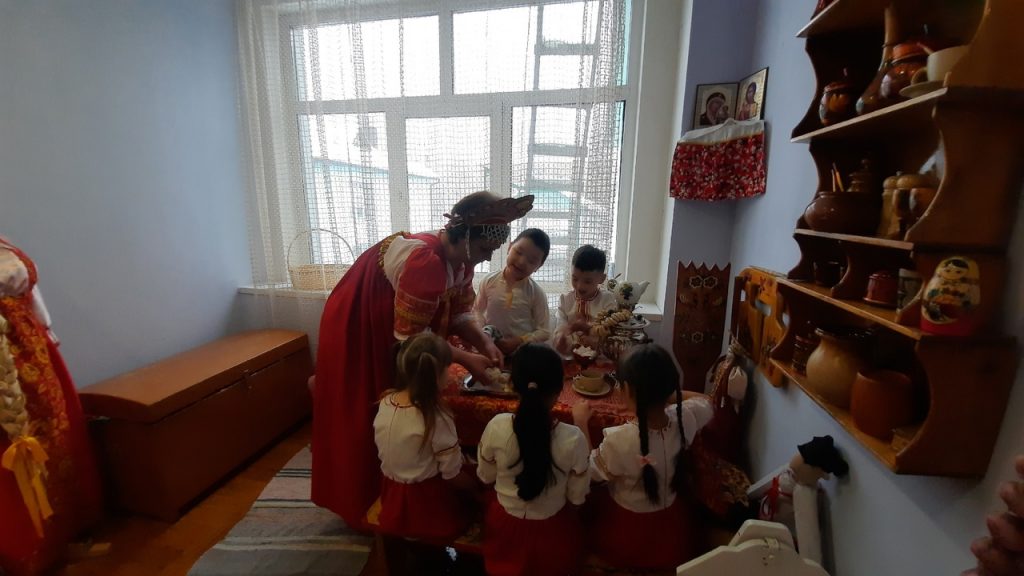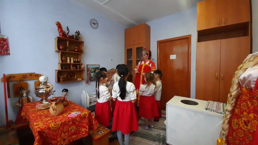 В нашем детском саду прошло открытое занятие «В гости в русскую избу». Учитель русского языка: Захарова Елена Александровна провела экскурсию в Русскую горницу. Ребята с большим удовольствием поиграли в русские народные игры, познакомились с обычаями и традициями русского народа.